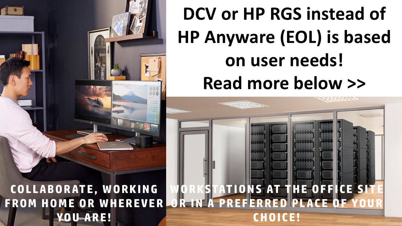 Om du funderar på hur du ska lösa dina behov kring digitala arbetsytor, fjärråtkomst och VDI, då rekommenderar vi DCV eller HP RGS, beroende på dina användares behov och som en ersättning för HP Anyware som HP har aviserat planerat End of Life (EOL), distribuerat som en 1:1-lösning eller som en hypervisor-implementering med eller utan NVIDIA GPU/vGPU och AMD MxGPU. Denna installation har många fördelar då du kan arbeta miljövänligt på distans precis som om du satt bredvid din stationära arbetsstation. Placera bara dina fysiska eller virtuella Linux- och Windows-arbetsstationer i ett rackbaserat datacenter eller på annan önskad plats och kom åt dem från din föredragna klient, dvs. Windows, Linux eller MacOS. Vänligen fyll i ditt intresse nedan, vi återkommer till dig så snart som möjligt!